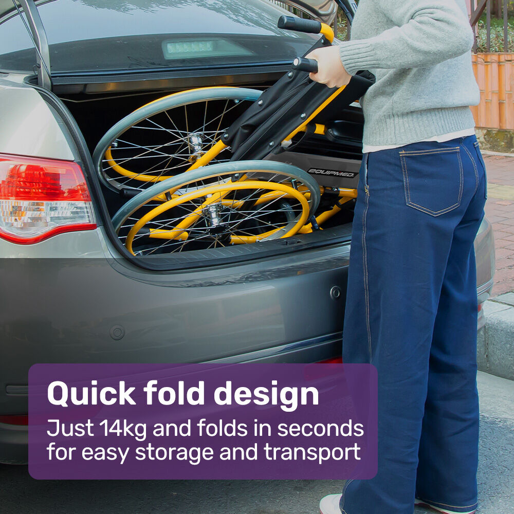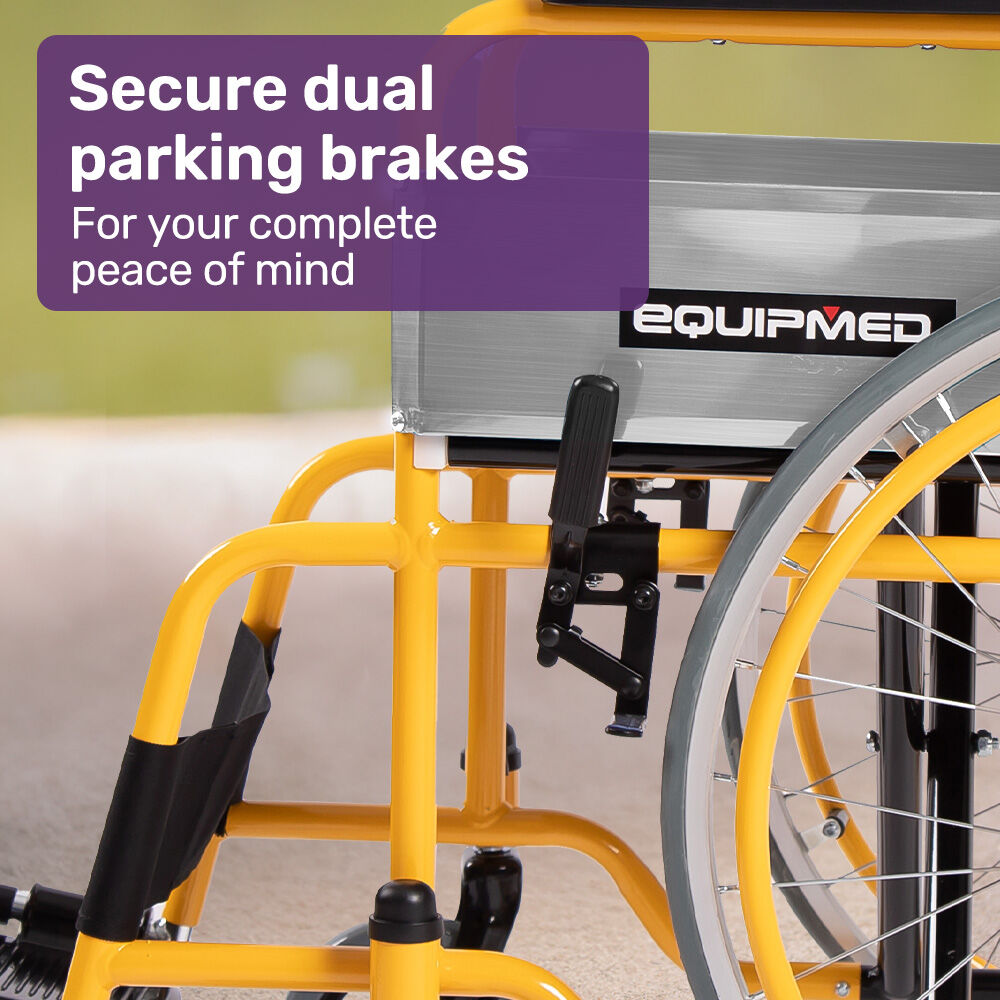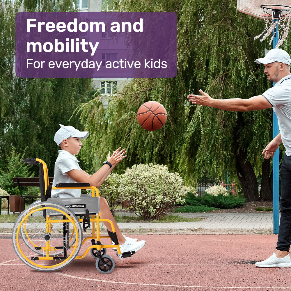 EQUIPMED Kids Paediatric Wheelchair, 100kg Rated, 110-140cm Rider Height, Quick Folding, Adjustable Footrests, 22" Wheels, Yellow