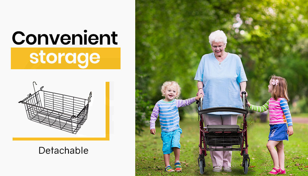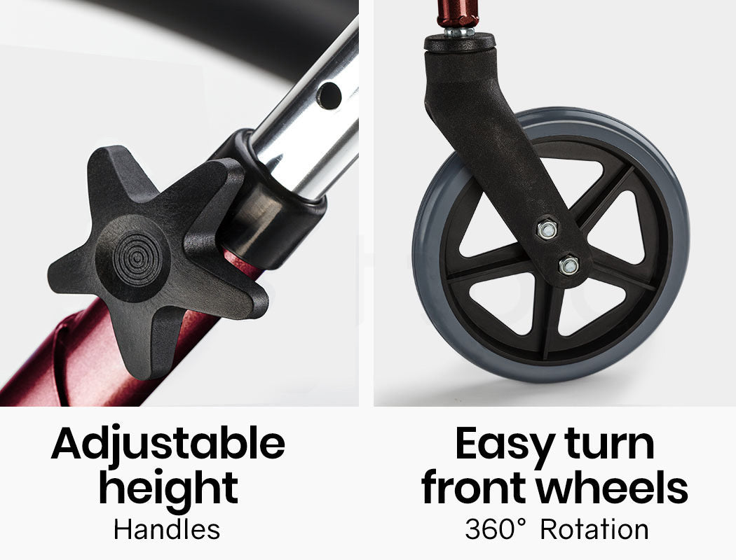 With dual-action loop handbrakes, adjustable handle height, contoured grips, padded seating and a comfortable padded backrest, your Equipmed rollator walker offers great ergonomics and comfort.