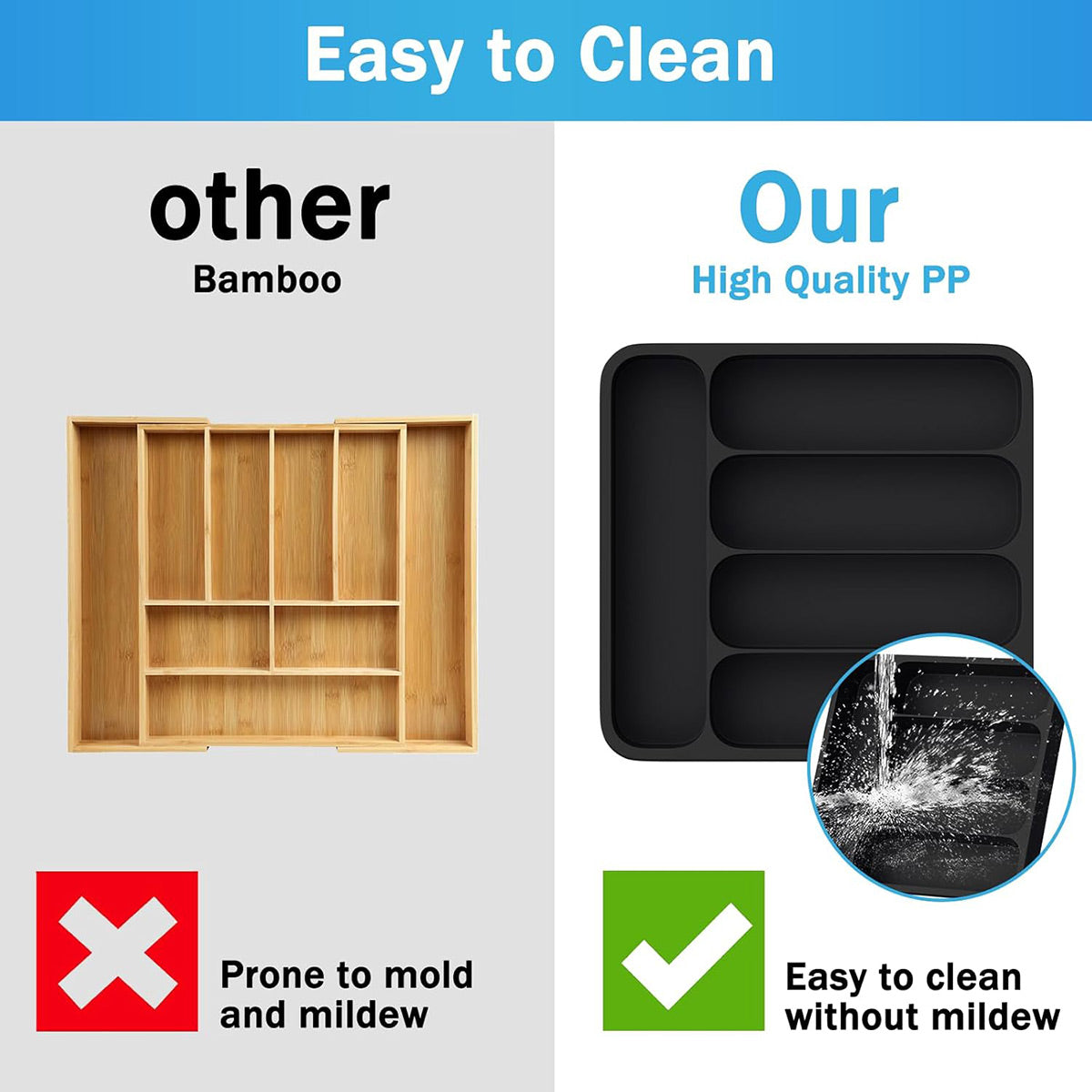 Maximise your kitchen drawer space with this adjustable cutlery organiser.Designed with five compartments and an expandable width, it keeps utensils neatly separated and easy to find.Made from durable, food-grade PP material, this tray provides a hygienic and practical storage solution for forks, knives, chopsticks, and more.Its sleek black and grey finish fits seamlessly into any modern kitchen setup.