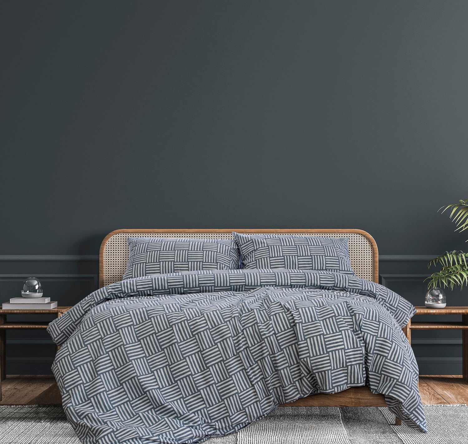 Ardor Boudoir introduces Fletcher Quilt Cover Set in a tonal Faded Indigo. Fletcher displays an organic thatched geo pattern adding soft masculine touch to your bedroom style.