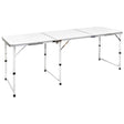 This foldable camping table with practical carrying handle will come in handy in kitchens, on patios, in gardens, and on picnics or camping trips. The table height can be adjusted to 55 cm, 62 cm and 70 cm. The camping table is light in weight. Thanks to the folding design, this camping table is easy to transport and can be stored away quickly when not in use. The carrying handle makes it very easy to bring the table with you when going out to have a picnic or camping trip. Thanks to the sturdy structure, this camping table has a high load capacity of up to 30 - 50 kg. Thanks to the metal frame and the robust MDF tabletop, it is highly stable and durable.