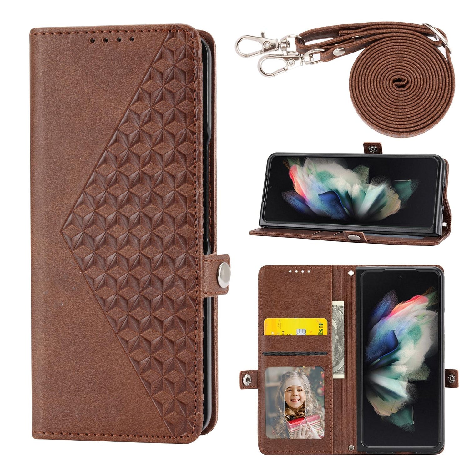 For Samsung Galaxy Z Fold4 5G Leather Grid Texture Phone Case With Lanyard - Brown