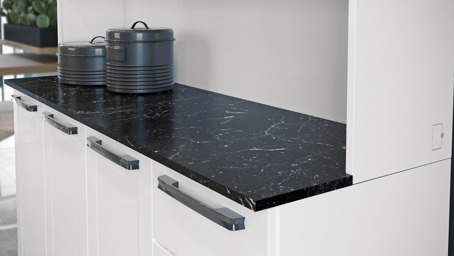 The top of the unit features a BP-coated MDP countertop in Nero Marquin pattern, resistant to heat up to 120°C – ideal for prepping meals or placing small appliances. Plus, the adjustable legs ensure stable placement on uneven floors, while the robust powder-coated steel structure guarantees long-lasting durability.