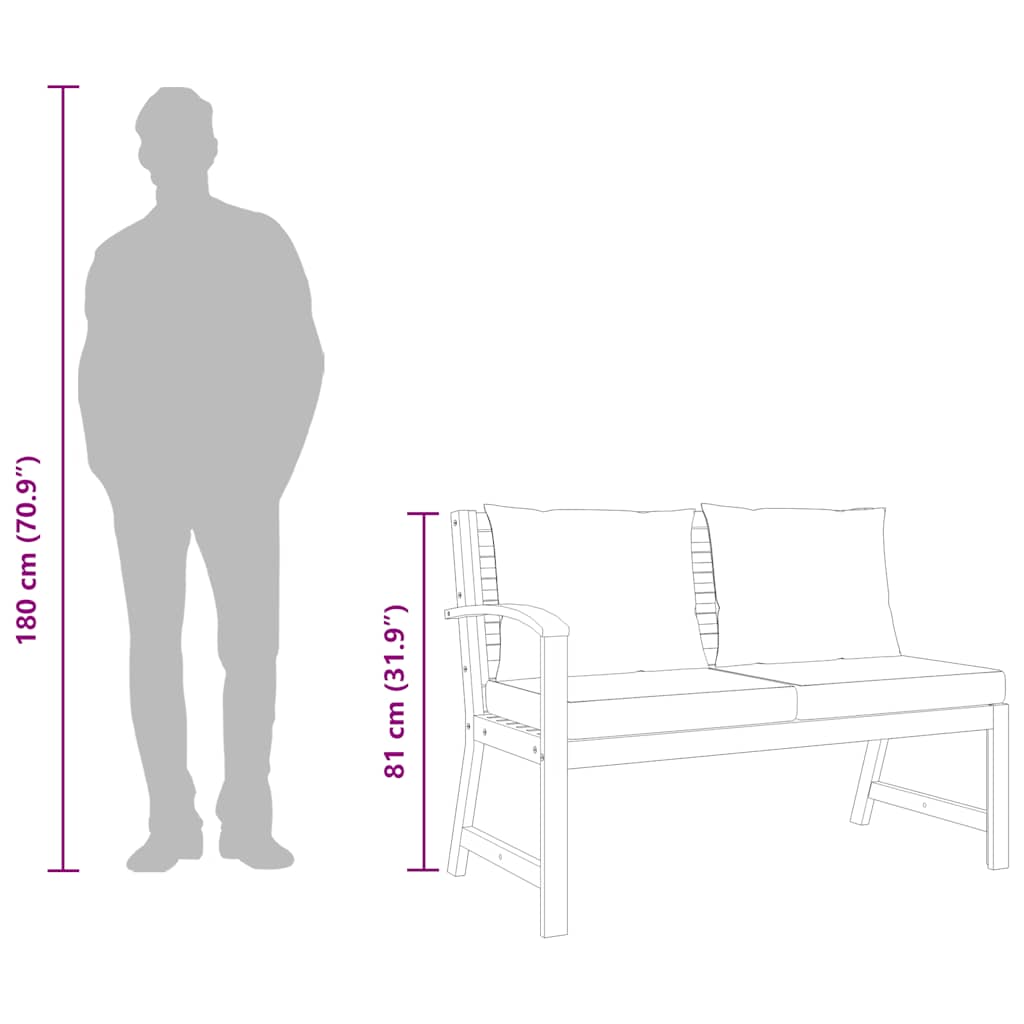 This stylish garden bench will add a touch of rustic charm to your patio or other outdoor living space! The bench is made of high-quality solid acacia wood, a tropical hardwood, which is weather-resistant and highly durable. Thanks to the oil finish, the patio seat has a warm colour and is easy to clean and maintain. In addition, delivery includes seat and back cushions with thick padding for ultimate comfort. This piece can be combined with other products in our shop so that customer can build their own sofa set.