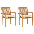 These wooden garden chairs add a vintage look to your garden, patio or any other outdoor living space. Constructed from extremely durable teak hard wood, this piece of teak furniture has been seasoned, kiln dried and then fine sanded to give a very smooth appearance. Teak wood is known for its exceptional strength and weather resistance, making it far more suitable for garden furniture than any other kind of wood. Teak wood is the perfect choice if you want to purchase a long lasting piece of garden furniture. The outdoor chair set features slatted backrests and slightly curved armrests, providing extra seating comfort. They are also stackable to save space when not in use. The included cushions are practical and have a decorative function.