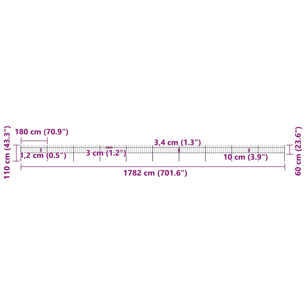 Create an elegant fence around your garden, home, or walkway with our garden fence! Our decorative steel garden fence, consisting of 10 fence panel and 11 posts, has a total length of 17 metres. It will form a sturdy, safe and maintenance-free perimeter barrier for your garden, home, or business property. With vertical bars with hoop top and strong horizontal brace as reinforcement to the frame, our garden fence will provide a high degree of security. Manufactured from heavy-duty, powder-coated steel, the outdoor fence is very strong and thus stable, sturdy and durable. Thanks to the included mounting materials, the garden fence is easy to assemble. Note: You can buy more sets to make the fence as long as you like.