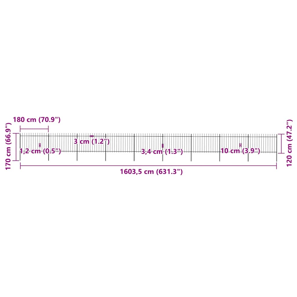 Create an elegant fence around your garden, home, or walkway with our garden fence! Our decorative steel garden fence, consisting of 9 fence panel and 10 posts, has a total length of 15.3 metres. It will form a sturdy, safe and maintenance-free perimeter barrier for your garden, home, or business property. With vertical bars topped with spear ends and strong horizontal brace as reinforcement to the frame, our garden fence will provide a high degree of security. Manufactured from heavy-duty, powder-coated steel, the outdoor fence is exceedingly stable, sturdy and durable. Thanks to the included mounting materials, the garden fence is easy to assemble. Note: You can buy more sets to make the fence as long as you like.