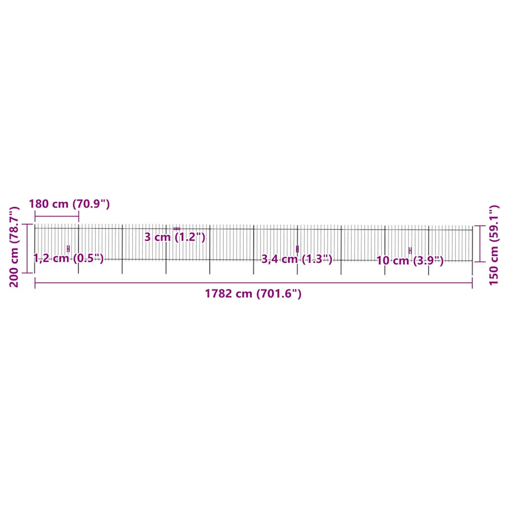 Create an elegant fence around your garden, home, or walkway with our garden fence! Our decorative steel garden fence, consisting of 10 fence panel and 11 posts, has a total length of 17 metres. It will form a sturdy, safe and maintenance-free perimeter barrier for your garden, home, or business property. With vertical bars topped with spear ends and strong horizontal brace as reinforcement to the frame, our garden fence will provide a high degree of security. Manufactured from heavy-duty, powder-coated steel, the outdoor fence is exceedingly stable, sturdy and durable. Thanks to the included mounting materials, the garden fence is easy to assemble. Note: You can buy more sets to make the fence as long as you like.