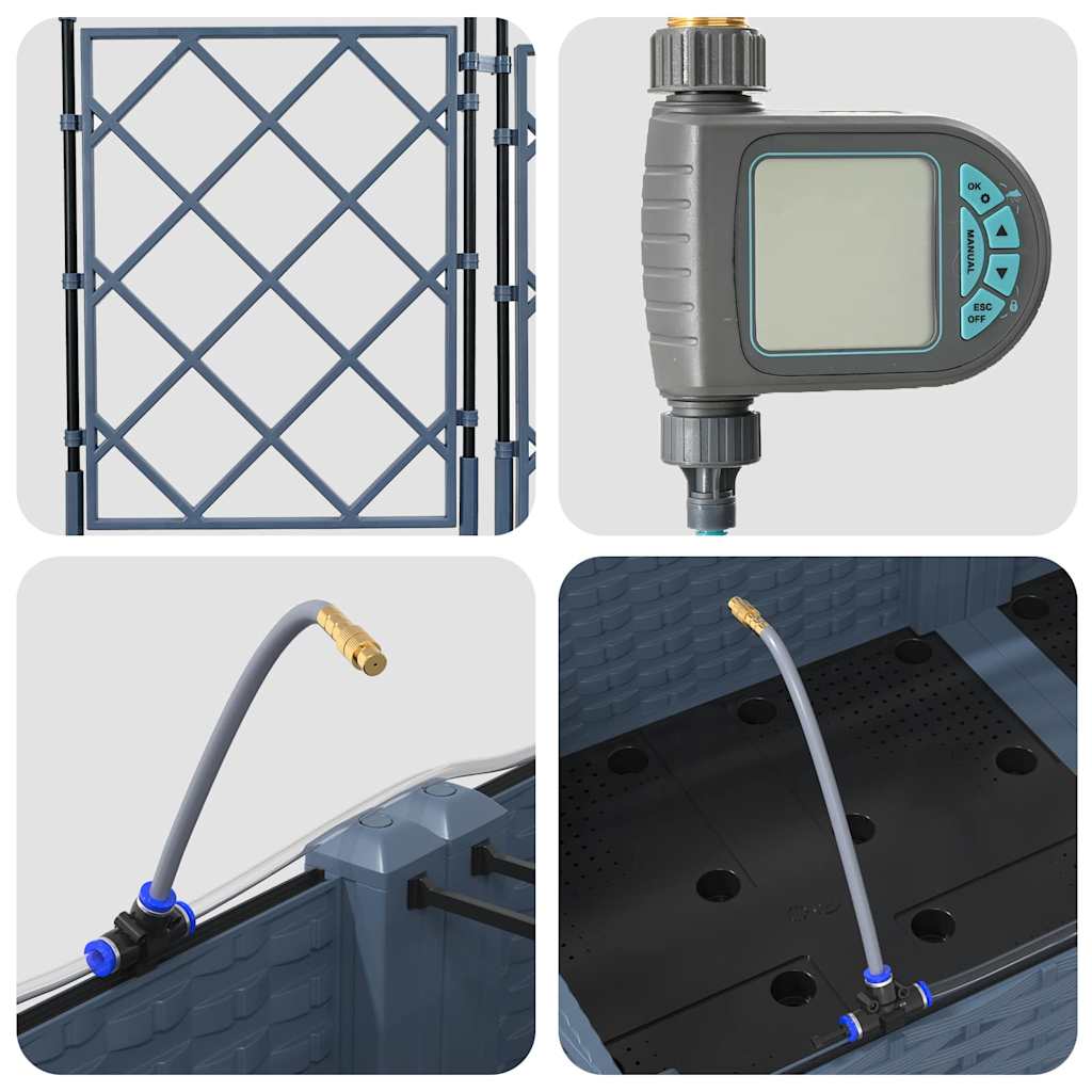 This garden planter with irrigation is a modern solution designed for outdoor lovers. Its sleek rectangular shape, along with a textured woven design, brings a contemporary vibe to your garden or terrace space. Perfect for planting all sorts of plants, this planter provides a solid, good-looking foundation for your gardening dreams. It fits right into any garden decor, offering a functional yet stylish option for home gardeners. The planter is perfect for those looking to jazz up their outdoor area with green life, thanks to its clever watering system that encourages healthy plant growth. Its raised design adds a touch of sophistication while staying practical, making this piece a must-have for gardening enthusiasts. Material Construction: This garden planter is made from UV-resistant steel, ensuring durability and standing up to weather changes. This choice of material provides solid protection, resisting harsh sunlight and seasonal shifts, keeping your plants thriving all year without compromising the planter's structure. Built-In Irrigation System: This garden planter features an advanced irrigation system that takes the guesswork out of watering. With built-in channels, it effectively delivers water right to the plant roots, ensuring they get enough moisture while wasting less water and promoting healthier growth. Modern Design: Showcasing a stylish woven pattern, this planter's elegant simplicity meets modern design standards. Its non-reflective matte finish adds a classy touch, allowing it to blend seamlessly into a variety of outdoor settings while reflecting contemporary style with its clean, understated lines. Versatile Use: Perfect for outdoor use, this planter is both decorative and practical. Its roomy interior fits various plant types, from lush ferns to colorful flowers, making it great for seasonal changes or year-round use, offering an excellent planting experience for both hobbyists and seasoned gardeners. Care & Maintenance: To keep it looking fresh, place this planter in a stable spot and avoid direct sunlight for too long. Clean regularly with a dry cloth, and make sure everything is securely put together during assembly to ensure stability and aesthetic value over time.
