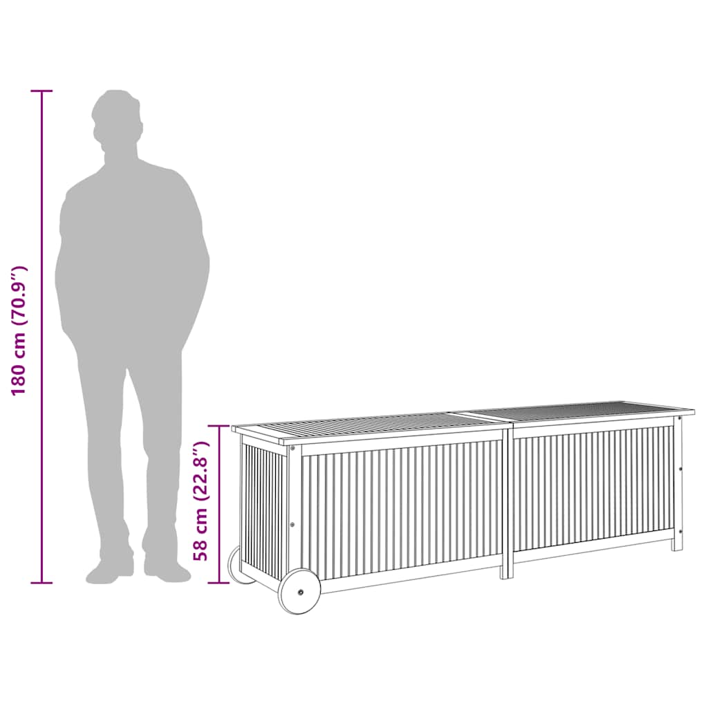 This wooden garden storage box provides ample storage space for garden furniture cushions, toys, gardening tools, and anything else you like to keep within reach in the outdoor living space. It can also be used indoors. Durable material: The outdoor storage box is made of solid acacia wood. Solid acacia wood is a beautiful natural material, which is dense, sturdy, and durable.Ample storage space: The storage space makes it easy to keep things organised. It is suitable for storing your cushions, pillows, blankets, toys, and other items.Practical design: The water-resistant inner bag with a zipper protects your items from moisture and dust. The garden cushion box is also easy to move around with the equipped wheels and handle. Good to know:To make assembly as easy as possible, each product is delivered with a manual. Note:To make sure your outdoor furniture stays beautiful, we recommend protecting it with a waterproof cover.