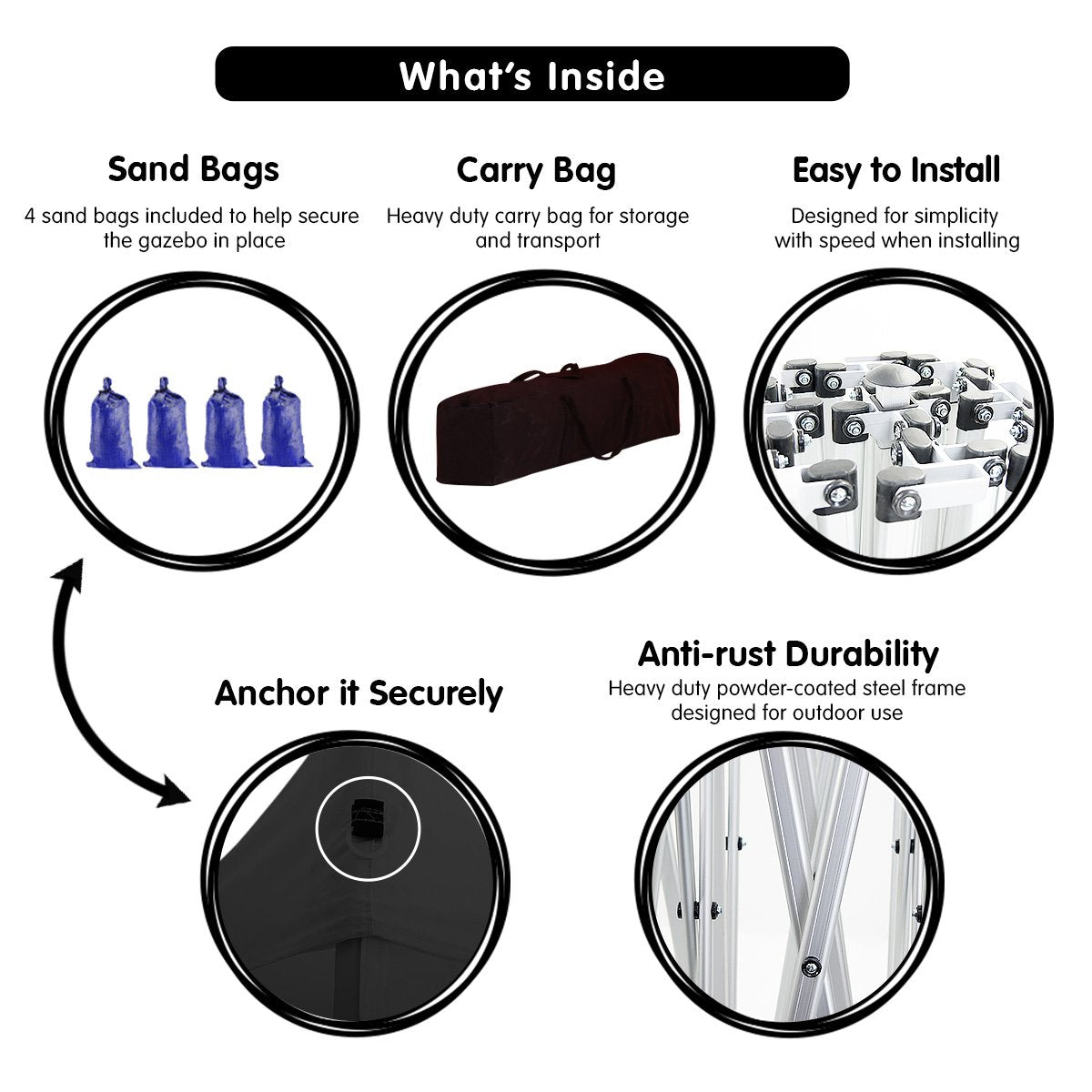 As well as the main unit and 5 walls this combo pack also comes with a handy carry bag and sandbags to help secure your marquee. And to make things a little easier our quality marquees are fitted with nylon inserts in the frame which eliminates frame jamming often experienced when erecting cheaper units.
