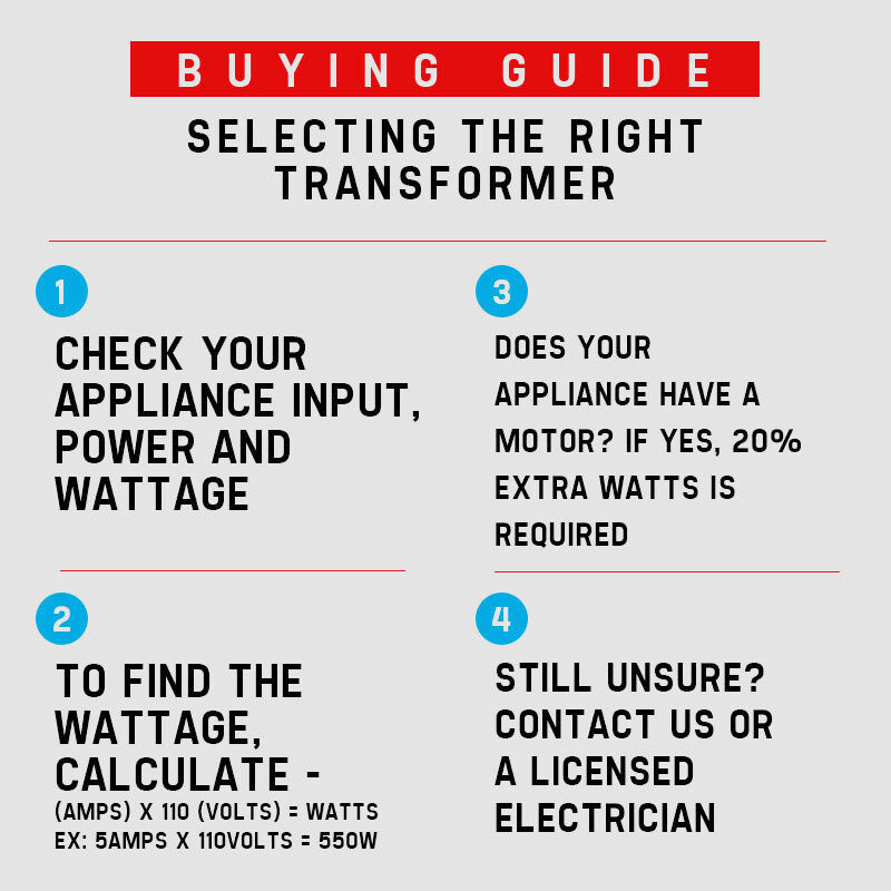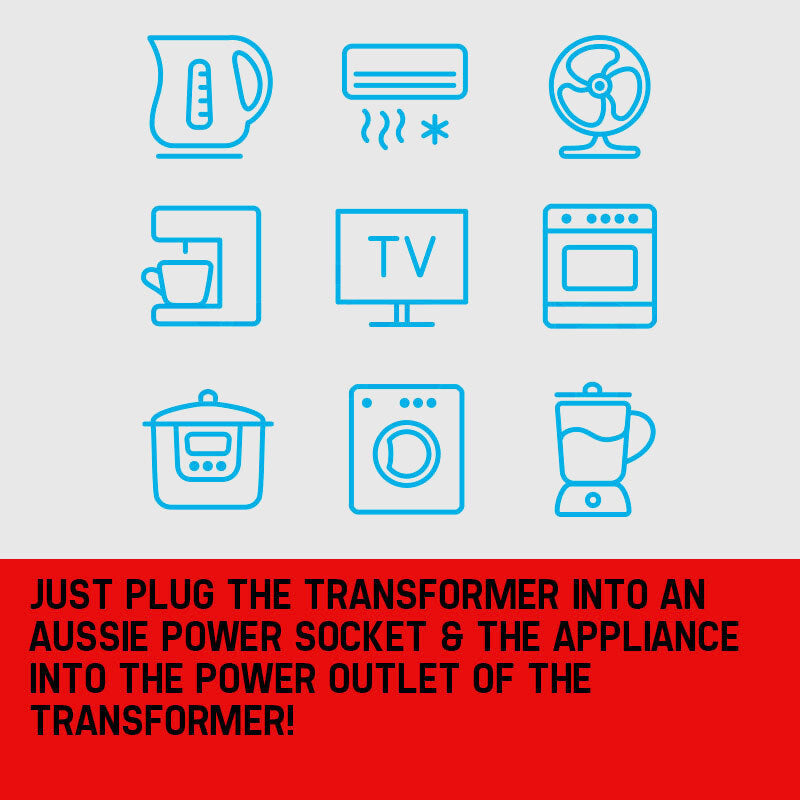 The GENPOWER GSD2000 converts alternating current (AC) 240 volts into 110 volts (also compatible with 115V & 120V) to allow your US appliance to run in Australia. Just plug the transformer into an Aussie power socket & the appliance into the power outlet of the transformer!