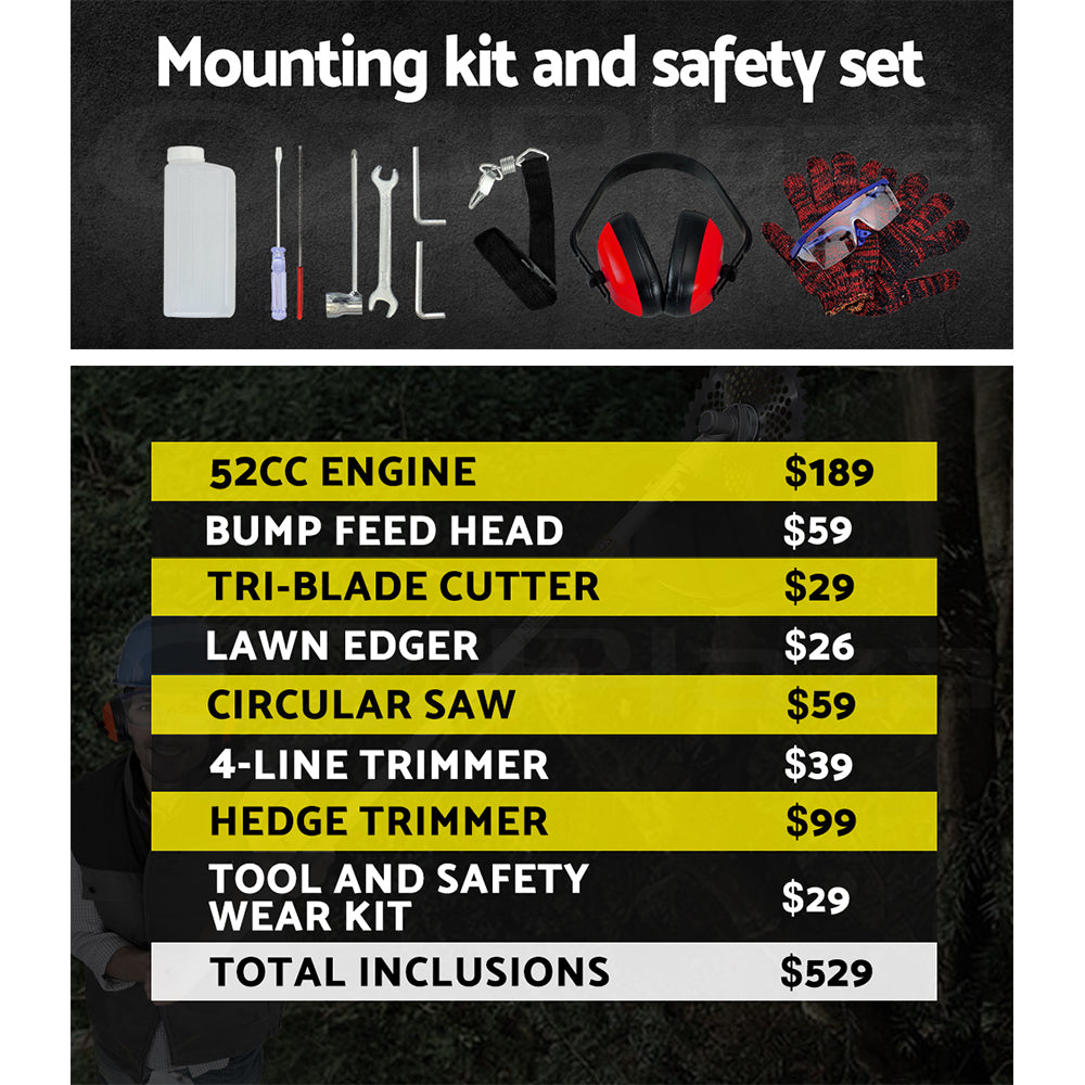 Finally, the ultimate gardening machine to rival Edward Scissorhands. Featuring no less than seven different gardening tools and their respective attachments, the GIANTZ 7-in-1 Pro-series Chainsaw is a mechanical marvel that makes light work of even the most challenging garden maintenance tasks. The 62cc 2-stroke motor is powerful and efficient and designed to cut, trim and sculpt with ease. It comprises a host of great features such as a super responsive motor, high capacity operations, built-in anti-vibration mechanism, auto chain lubricator, adjustable chain oil feed and easy start system. Plus, 26mm premium anodized commercial alloy is used for the shafts and poles and commercial grade quick connect couplings are equipped with dual ball-bearing floating centres to make operating the tools smooth and easy.Genuine commercial spline fastening also ensure maximum stability when using the extensions. This exceptional chainsaw also comes loaded with a bonus accessory kit, including gloves, ear muffs, mini tool kit and fuel mixer.
