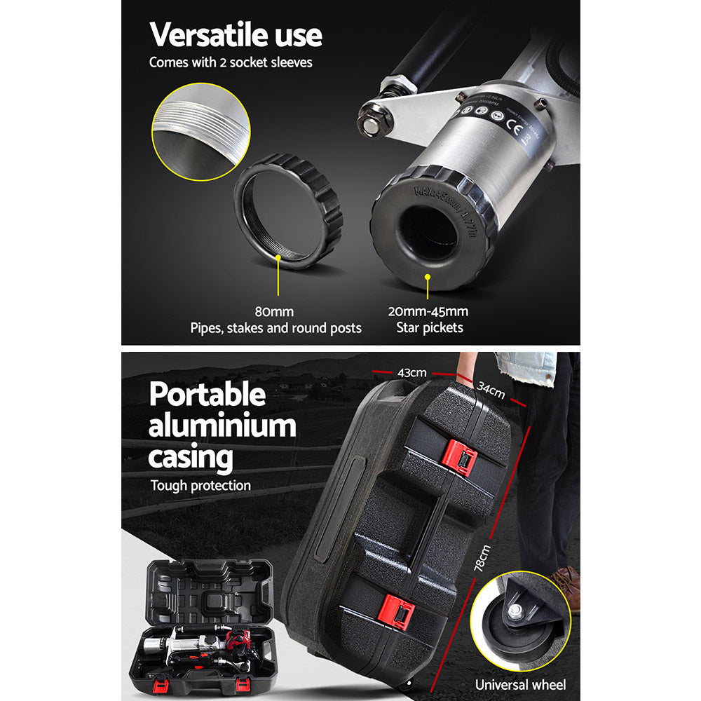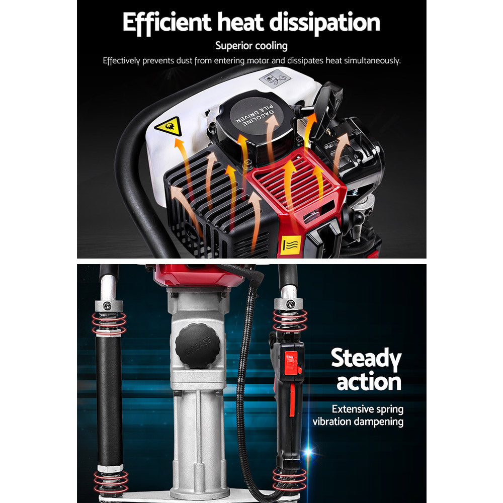 The Giantz Petrol Post Driver is as tough as it looks. No drive is too difficult for exceptional post driver. Powered by a class-leading petrol motor, the driver will hammer down stakes, pegs and posts of up to 80mm in diameter firmly into the ground. Featuring a hardened hammering pin with absolute power and unrivalled impact frequency, the post driver gets the job done in minutes with minimum hassle. Better still, the driver is designed for superb handling with soft rubber grip handles and vibration absorbing springs to minimise fatigue. It features interlocking controls with throttle lock, kill switch and throttle adjustor, all close at hand.