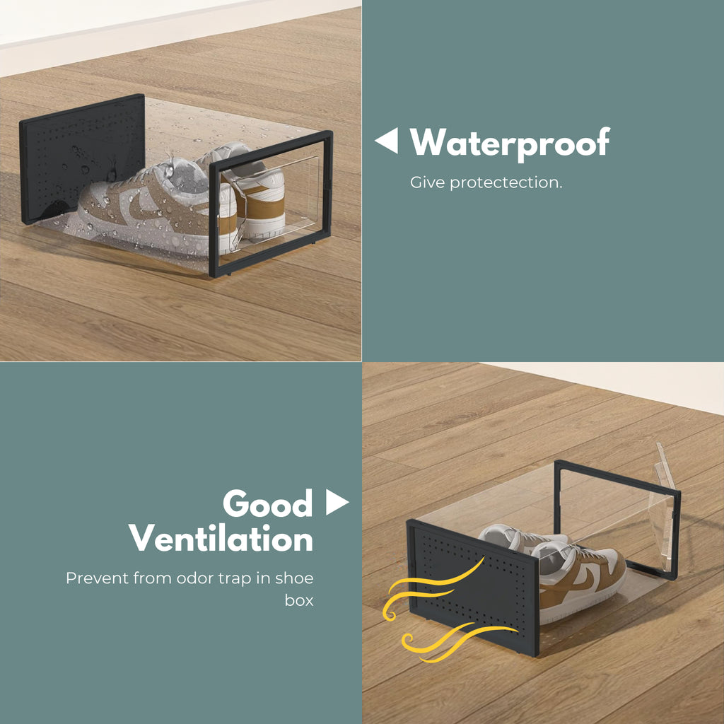 Each package includes 24 Clear Shoe Rack Boxes with sleek black frames, providing ample space for your shoe collection.