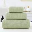 Indulge in the unique texture and superior performance of our 100% Cotton Waffle Weave Towel Set. This beautifully crafted 3-piece collection, featuring a bath towel, hand towel, and face cloth in a calming light green, brings a touch of modern elegance and exceptional functionality to your bathroom. The distinctive honeycomb (waffle) weave is not only stylish but also enhances absorbency and speeds up drying time.