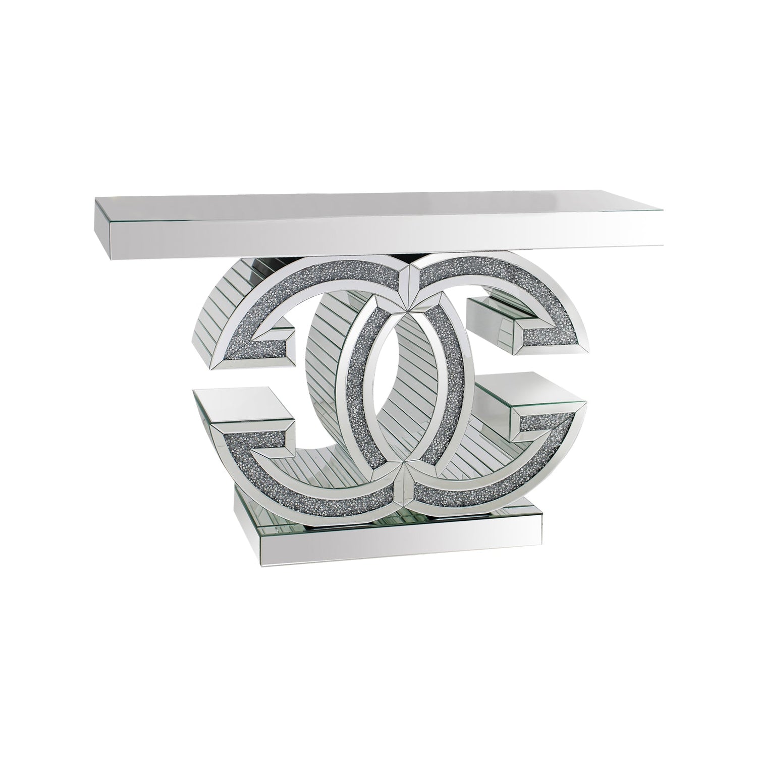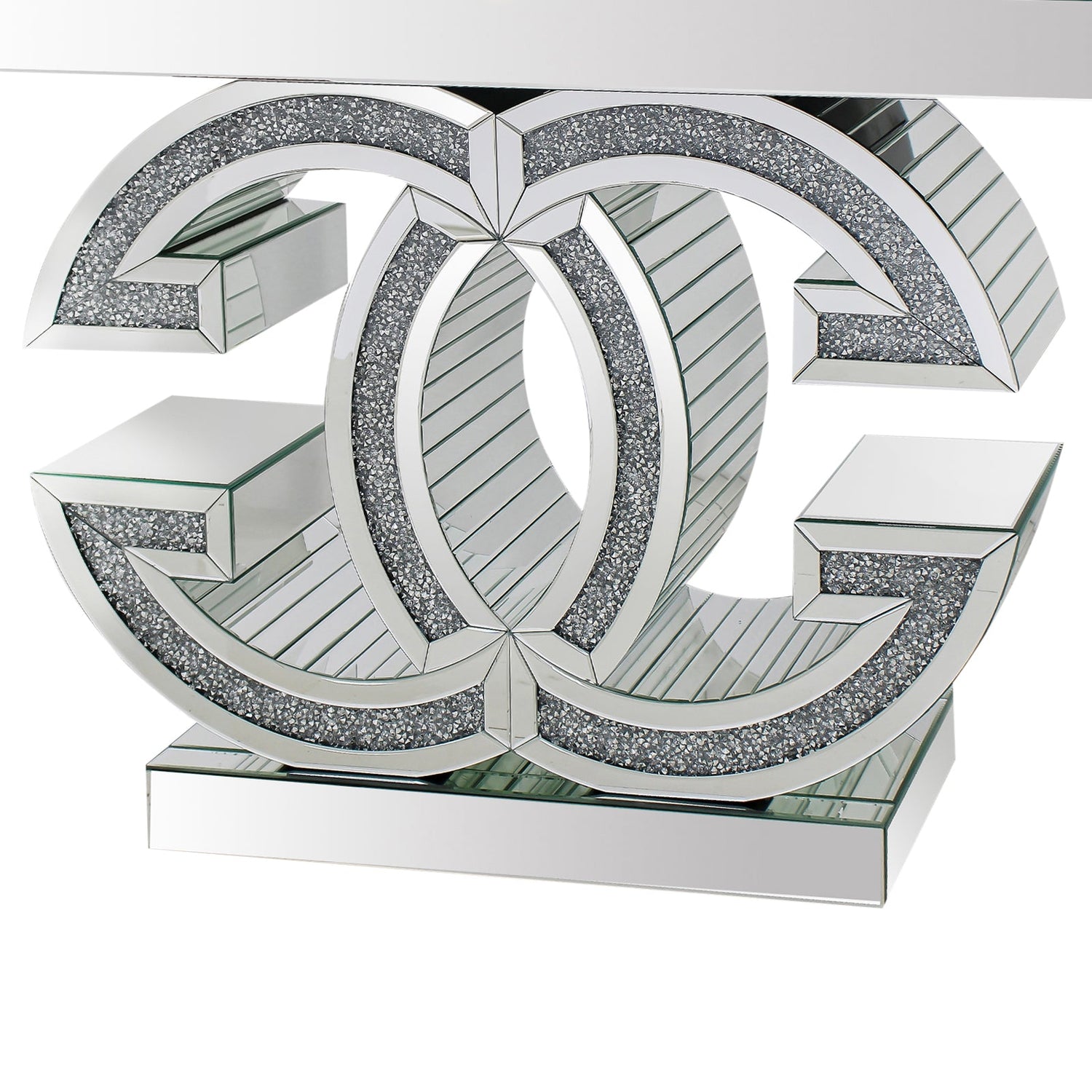 This beautiful table has a gorgeous base with crushed Acrylic diamond adornment. Underneath the table top, there is a shiny ring shaped design which overlaps with each-other beautifully. This aesthetic piece of furniture is sure to draw attention.