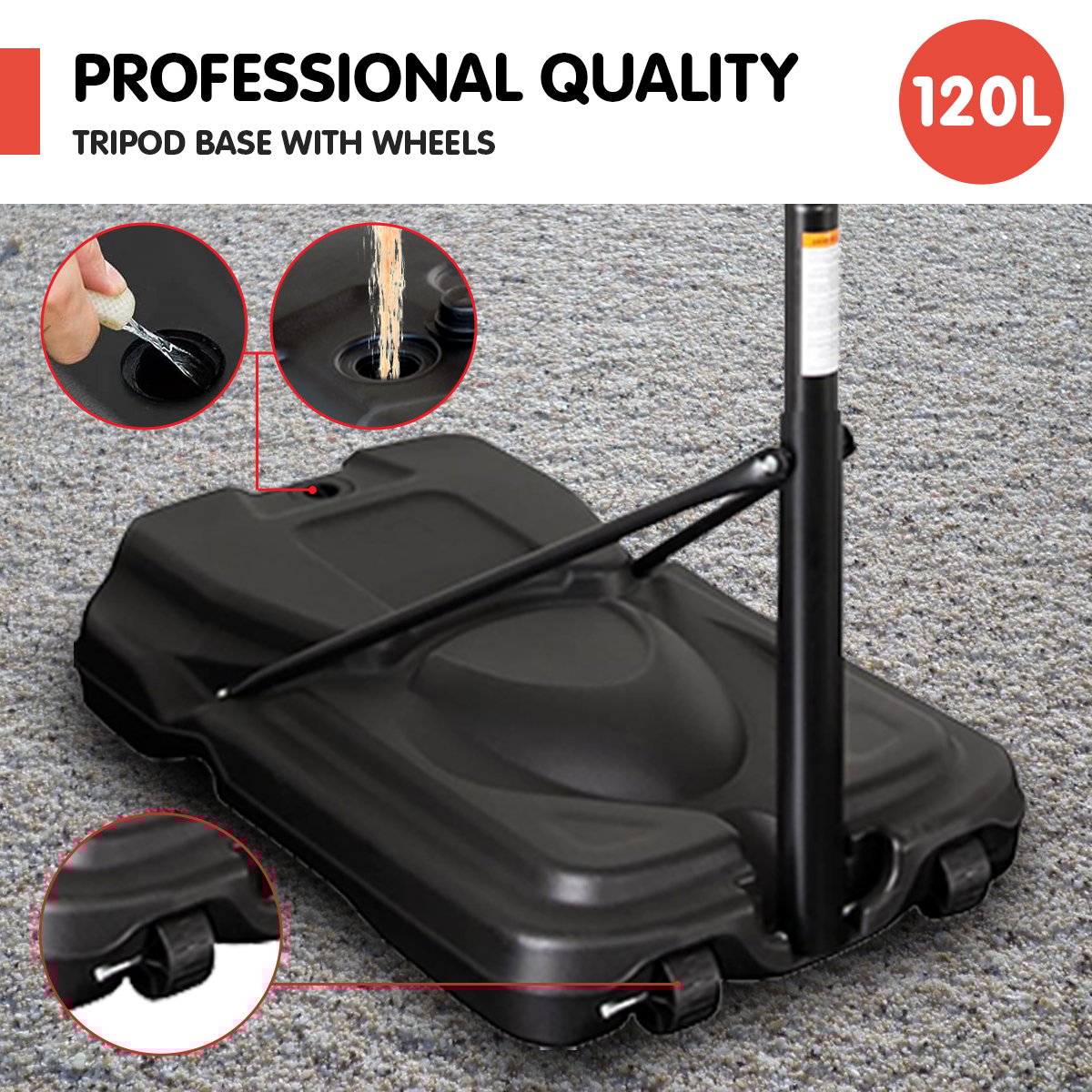 - 120L base can be filled with water or sand for stability