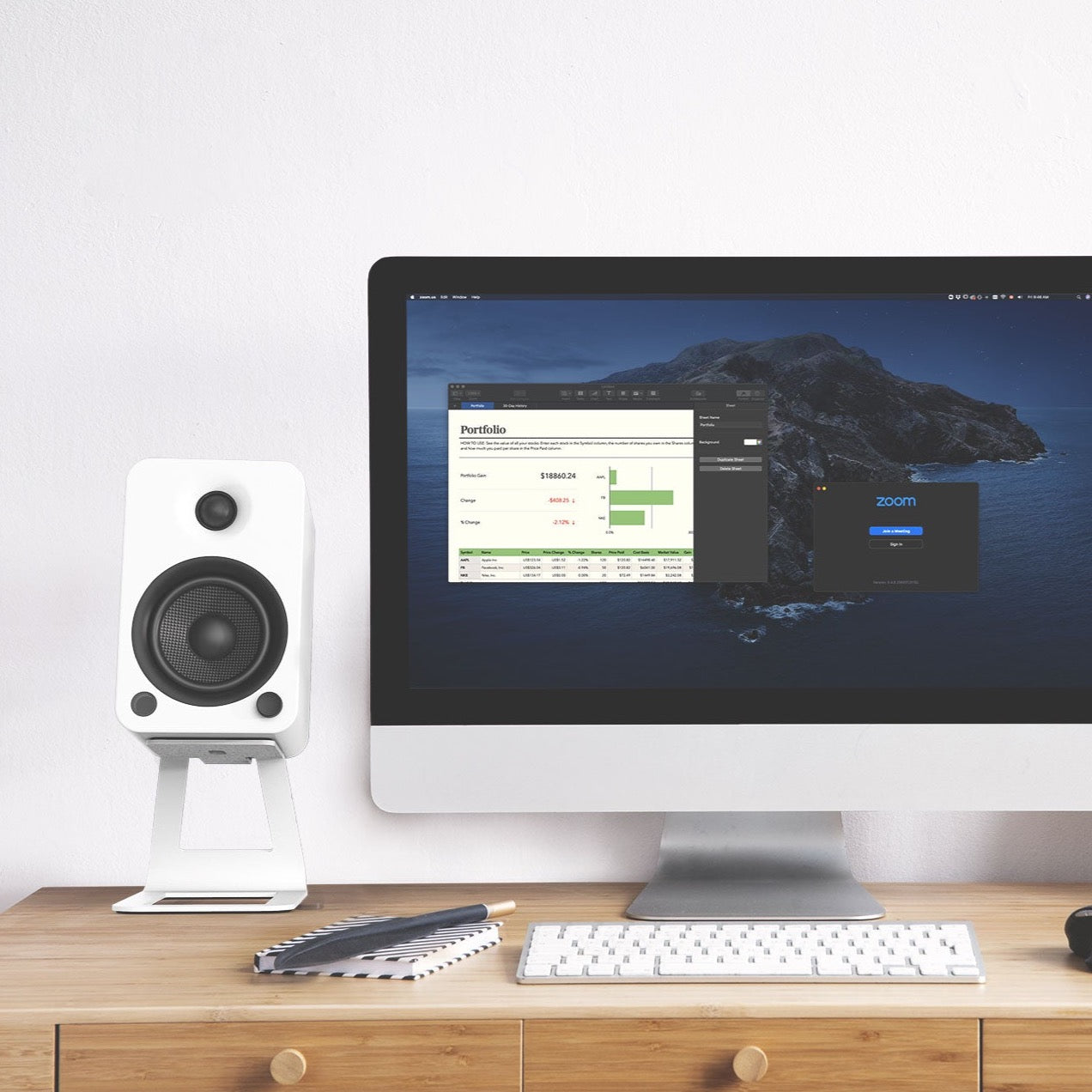 Kanto SE4W Elevated Desktop Speaker Stands for Midsize Speakers - Pair, White - Take your sound game to the next level with the SE4 Elevated Speaker Stand. Standing at a height of 5.6", the SE4 boosts your speakers up and off the surface of your desk so that they're better aligned with your ears to give you a flawless on-axis response. Its cantilevered and angled platform is designed to absorb resonance and deliver a pure sound without any reflections from nearby surfaces. 2.0mm of silicone padding provide a strong grip that helps keep your speakers and stand in-place. For maximum protection, the SE4 comes with a set of mounting screws that you can use to secure compatible speakers to the stand to prevent falls and accidents. The SE4 is available in both black and white and can hold up to 9 lbs.