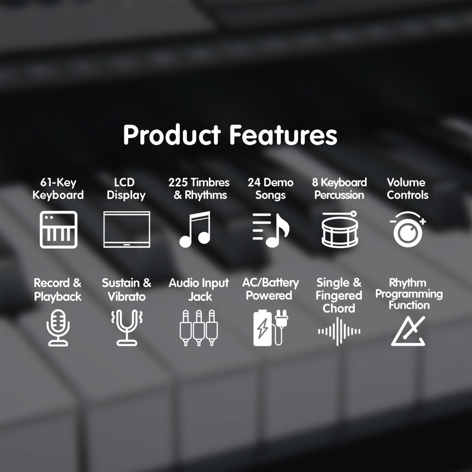 With 255 timbres, 255 rhythms, 8 keyboard percussions and 24 demonstration songs, this keyboard offers a versatile range of sounds, perfect for practice and music creation.