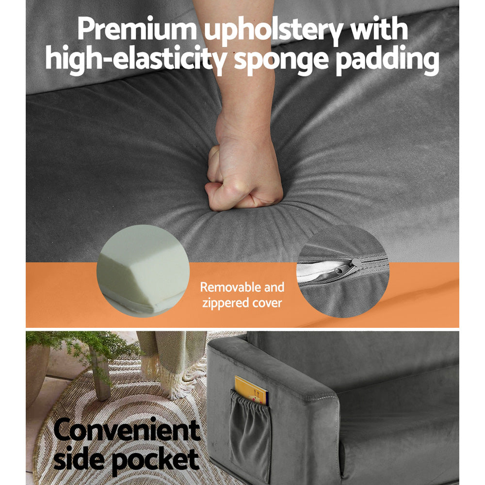 Featuring 2-in-1 design, our kids sofa folds out into a bed. It can accommodate two to three kids. Upholstered in premium fabric, our kids sofa features solid wooden construction for durability and sturdiness. The high elasticity sponge padding makes the seat comfortable, soft, and cosy and offers excellent back and seat support. Furthermore, the padded armrests with side pockets add to your comfort and convenience.