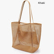 Khaki Large Mesh Beach Tote Bag - Lightweight & Foldable Shoulder Bag with Secure Zipper Pocket