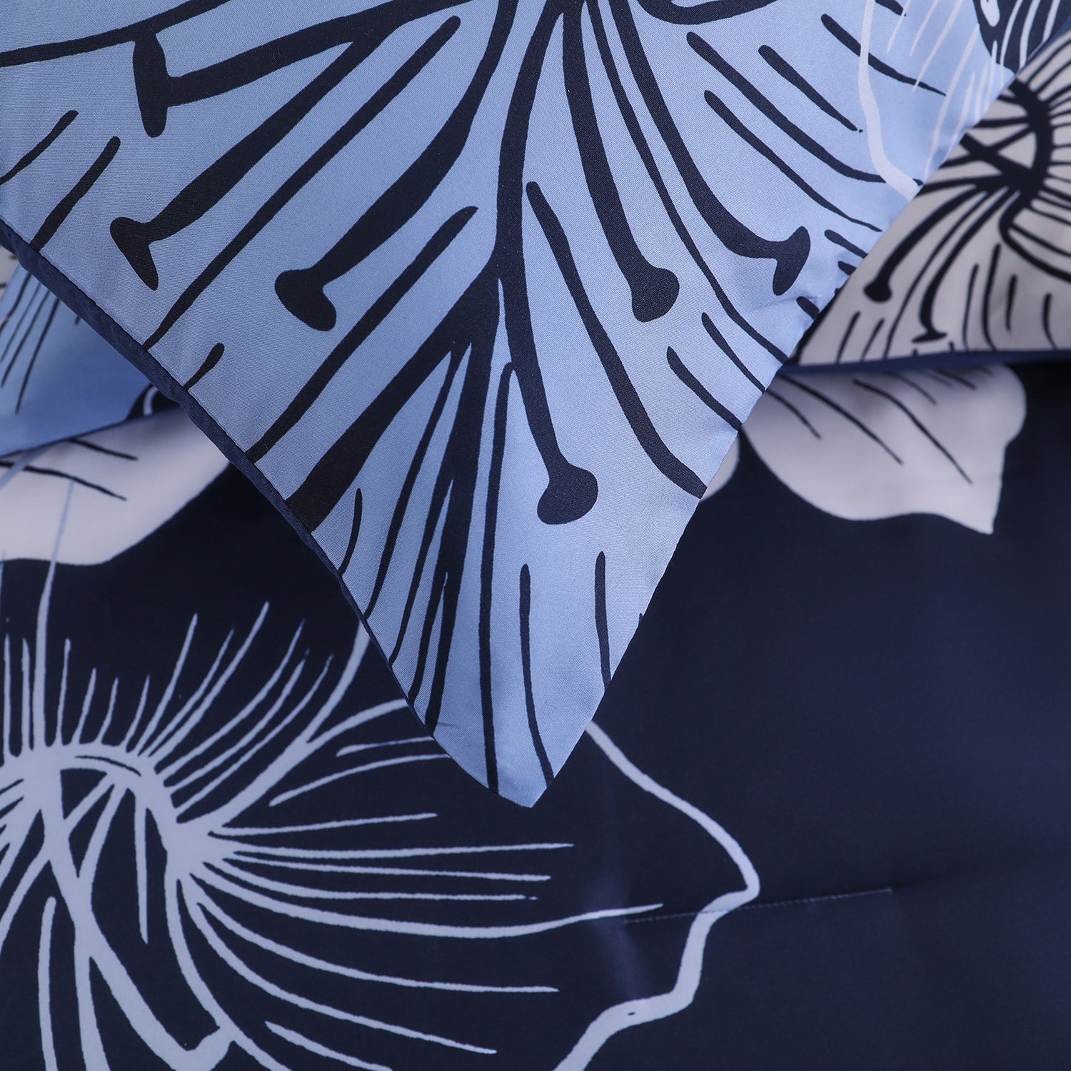 The King Comforter Set in navy blue floral design brings effortless style and year-round comfort to your bedroom. Crafted from soft microfiber, this 3-piece set includes a generously sized comforter and two matching pillowcases. Designed to be lightweight yet durable, it offers a breathable layer that keeps you comfortable in every season while maintaining a smooth, inviting texture.