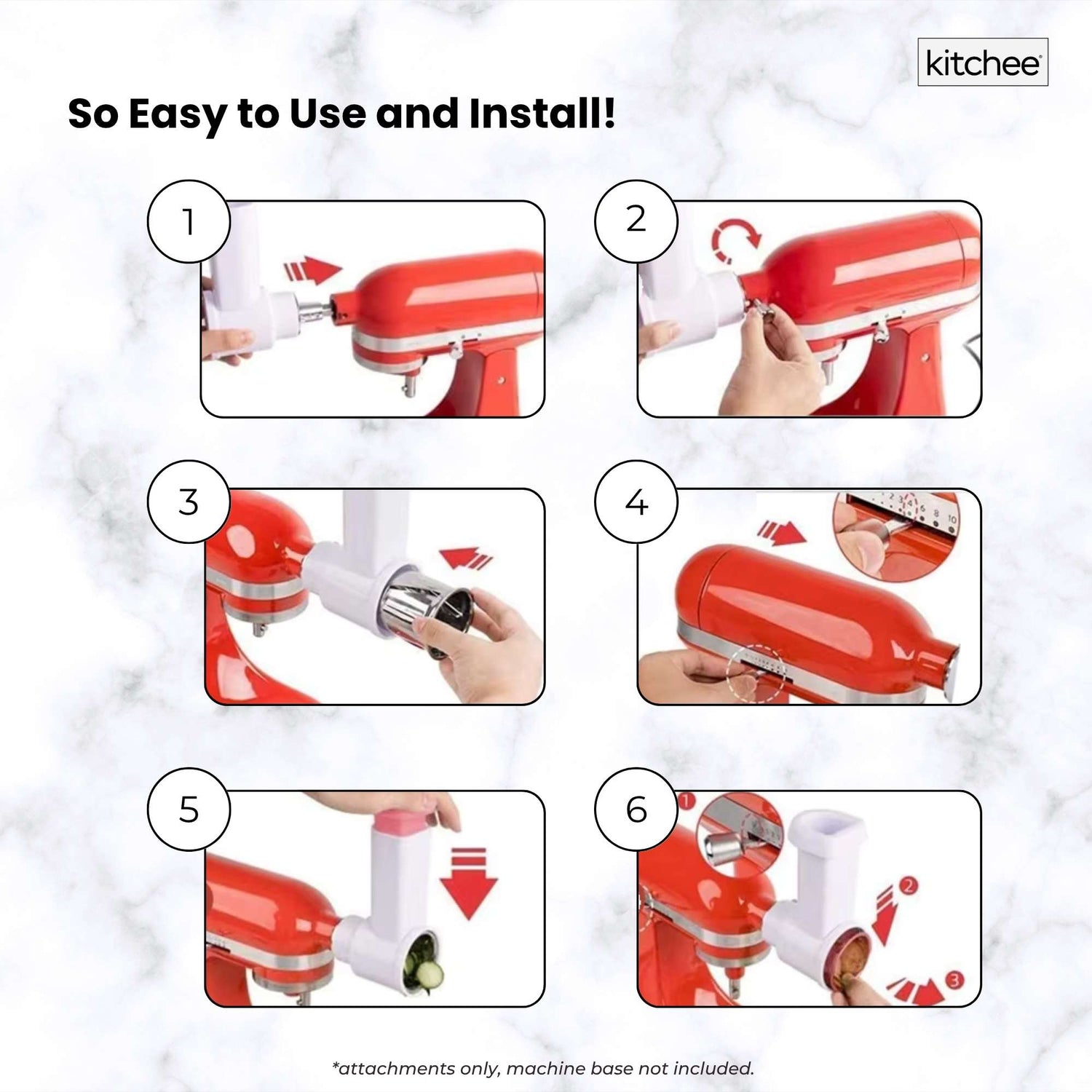 Kitchee Food Processor Attachment – Compatible with Most Stand Mixers. Turn your stand mixer into a powerful food processor! The Kitchee attachment lets you slice, shred, and grate vegetables, cheese, fruit, and more in seconds.