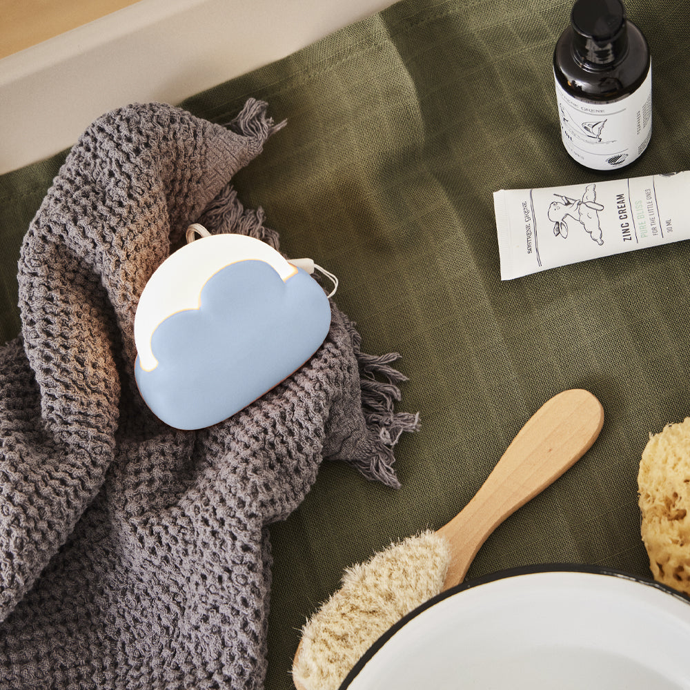 Kreafunk Kids Cloudy Lamp - Cloudy Blue. Cloudy Soft Glow Night Lamp.Meet Cloudy, the irresistibly cute LED night lamp designed to bring comfort and charm to your baby's space. Whether it's gently illuminating the crib or adding a cozy touch to your nursing table, Cloudy is your perfect nighttime companion.With a built-in timer function, you can set it to turn off automatically after 2 hours or let it softly glow through the night. Cloudy features warm, cool, and red light settings, so you can tailor the ambiance to any mood or moment from bedtime cuddles to nighttime nursing.Crafted with care, Cloudy is made from 100% recycled GRS-certified plastic, is PFAS-free, and water-resistant (IPX2 rated). It's safe to the touch and doesn't heat up, so it's completely safe for curious little hands.