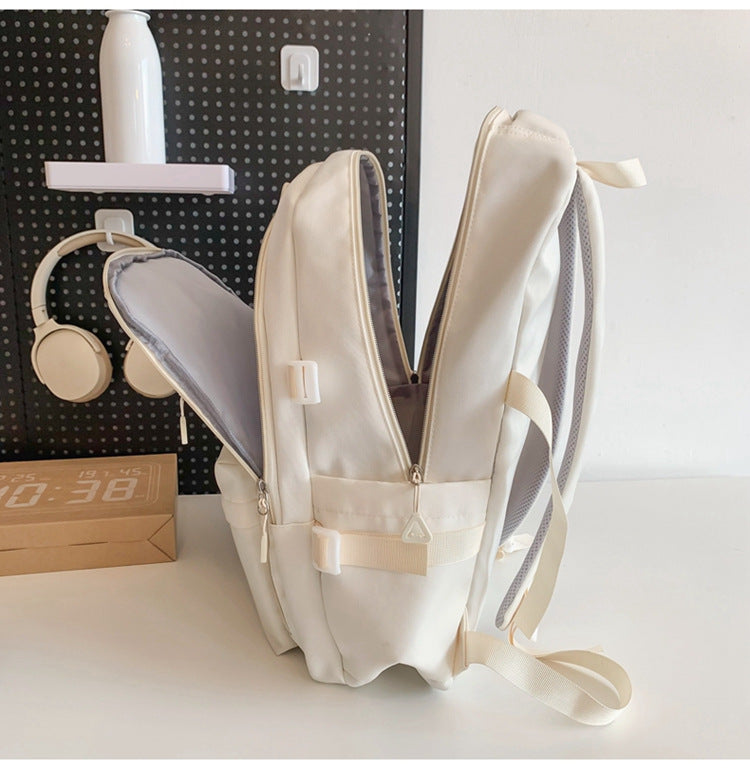 Carry your essentials in style and comfort with this Large Capacity Nylon Backpack. Designed for versatility and durability, this backpack is perfect for students, commuters, and travelers alike. It features a spacious main compartment capable of holding a tablet computer, A4 magazines, a short umbrella, phone, power bank, and more. Crafted from durable nylon fabric, it's built to withstand daily wear. The backpack includes multiple thoughtfully designed pockets: a front zippered pocket, side pockets ideal for water bottles or small umbrellas, and a secure back zippered pocket for valuables. Adjustable shoulder straps ensure a comfortable fit, while triangular reinforcements add to its durability. Smooth zippers and a convenient top handle complete this practical and stylish backpack.