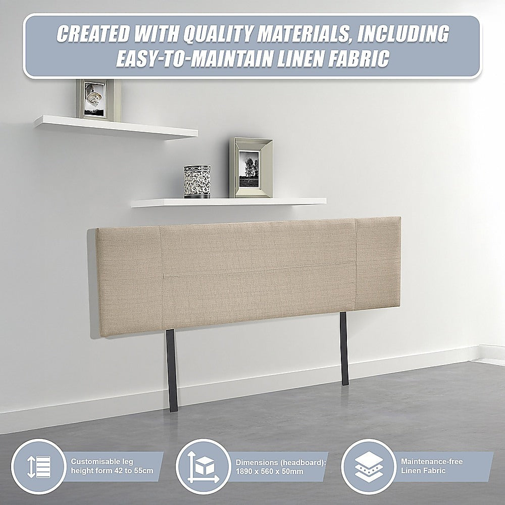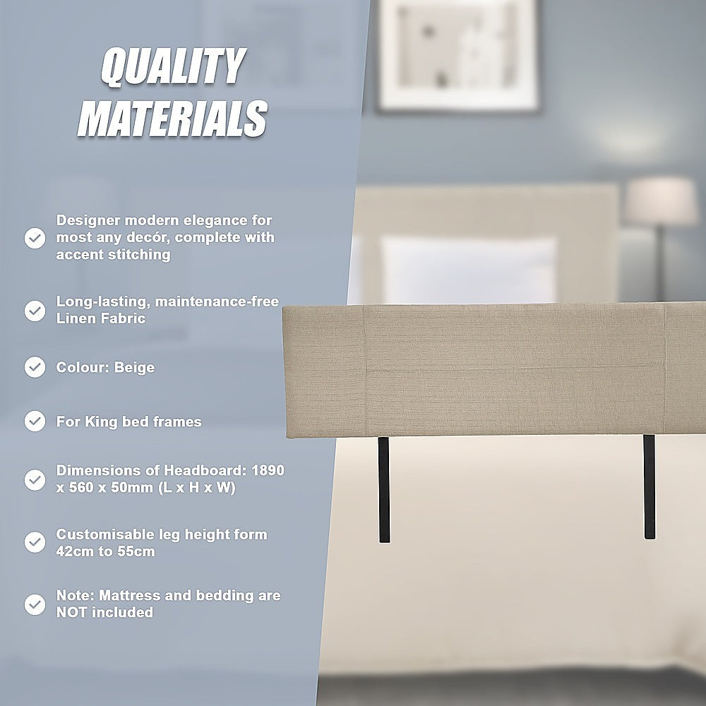 This headboard for standard King-sized bed frames is created with quality materials, including easy-to-maintain Linen Fabric that will maintain its sophisticated look for many years to come. This particular model comes with elegant stitching accents that provide just the right level of understated pop. A neutral beige will blend seamlessly with a wide variety of bed frames and other bedroom furniture.