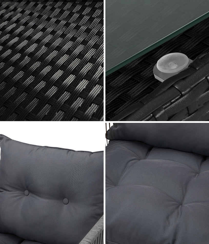 Plus, the matching PE wicker coffee table with a durable 5mm thick glass top signifies an intention to up the elegant factor while enjoying your cherished moments with friends and family over drinks and snacks, or simply appreciating its captivating presence in your home.