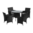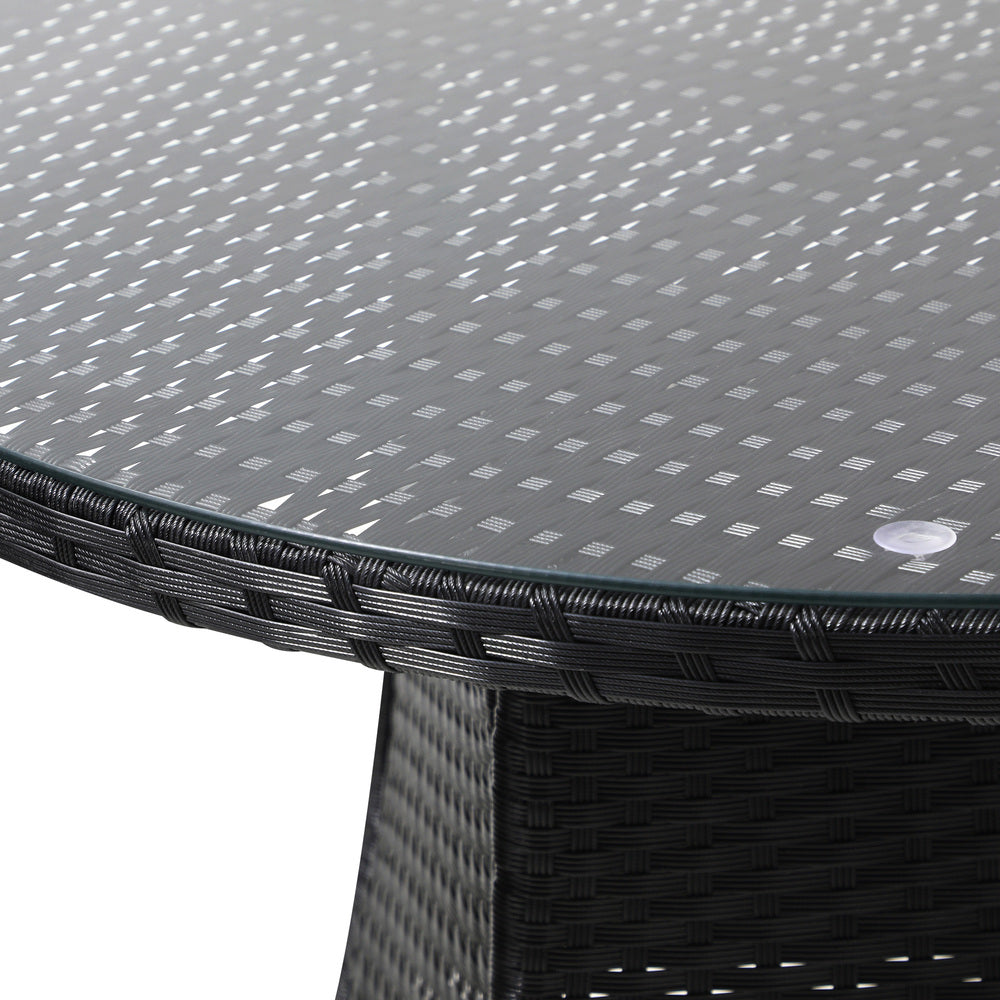 Gather your family and friends around the elegant round table, which serves as the centerpiece of this ensemble. Its generous size allows for accommodating intimate gatherings or larger parties with ease. The smooth glass tabletop adds a touch of sophistication, making it easy to clean and maintain while showcasing the intricate wicker pattern below.
