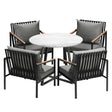 The set includes a nice round table and comfortable chairs, creating an inviting and functional outdoor dining area. The table provides ample room for serving meals, playing games, or simply enjoying drinks with friends and family. Its sturdy construction ensures stability, while the sintered stone tabletop surface makes cleaning a breeze.