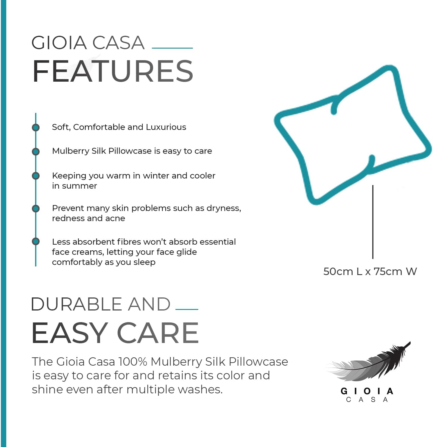Gioia Casa Luxury Pillowcase - 100% Pure Mulberry Silk on Both Sides - Soft Anti-Wrinkle, Hypoallergenic, Washable Bed Pillowcases - Premium Pillow Cover for Hair and Skin Protection