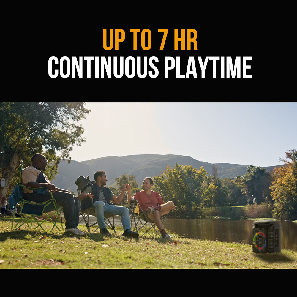 Turn up the energy with this MB series PS61 Bluetooth Party Speaker by Overdrive! Built for the outdoors with an IPX4 rating for water resistance, this portable speaker offers powerful sound, vibrant LED lights, and up to 5-7 hours of battery life.