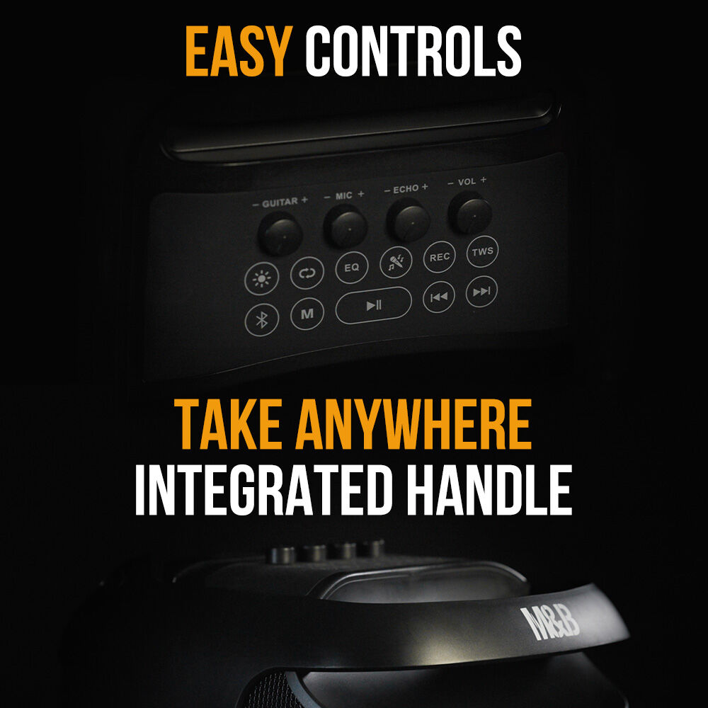 M&B Portable Splash Proof 80W Bluetooth Party Speaker, IPX4, TWS Pairing, Multi-Input, Lithium Battery, RGB, USB Charging