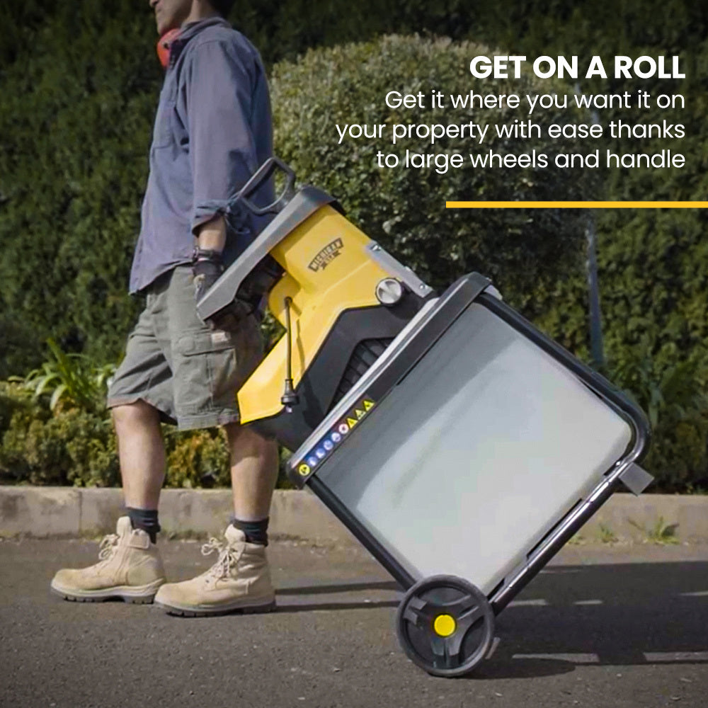 Why would you consider a petrol powered chipper when this powerful high torque 2400W electric motor delivers the continuous shredding power to devour bushy materials of up to 45mm in diameter! Unlike most chippers, shredder and mulchers, crushing impact shredders can deal with fibrous material such as palm fronds as they operate at a low speed, using a large barrel with many blades to crush and cut, rather than just shredding it.