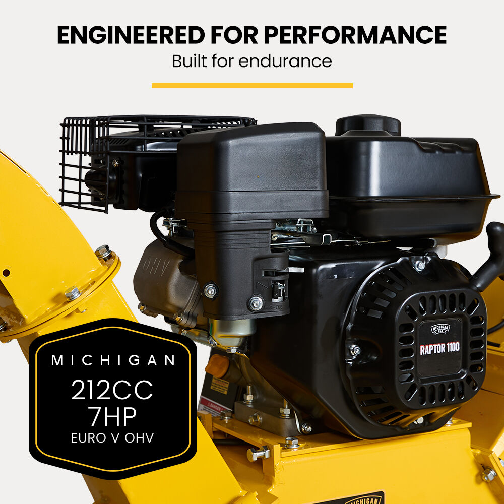 The Michigan Raptor 1100 Wood Chipper is built for homeowners and professionals who want dependable power for tough yard work. With a 212cc 7HP engine, it chews through branches up to 50mm thick, turning bulky waste into neat, manageable chips. Its heavy-duty steel construction and twin V-belt drive deliver long-lasting reliability, while the low-oil shutdown and emergency stop bar provide added peace of mind. Designed for easy maneuvering and smooth operation, the Raptor 1100 is a tough, no-nonsense performer that makes light work of property maintenance and clean-ups.