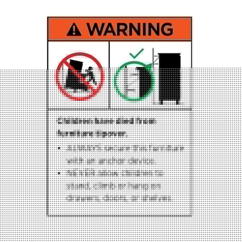 - NEVER allow children to stand, climb, or hang on drawers, doors, or shelves.