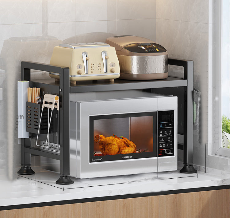 This new multifunctional microwave shelf can store much more kitchen stuff. It has two sides of hanging board. You can hang with three hooks, cutlery tray and spice rack or whatever you want to. It will save more your kitchen space and make it look much more tidy and organized. It is a highly recommended new shelf for your home and kitchen.