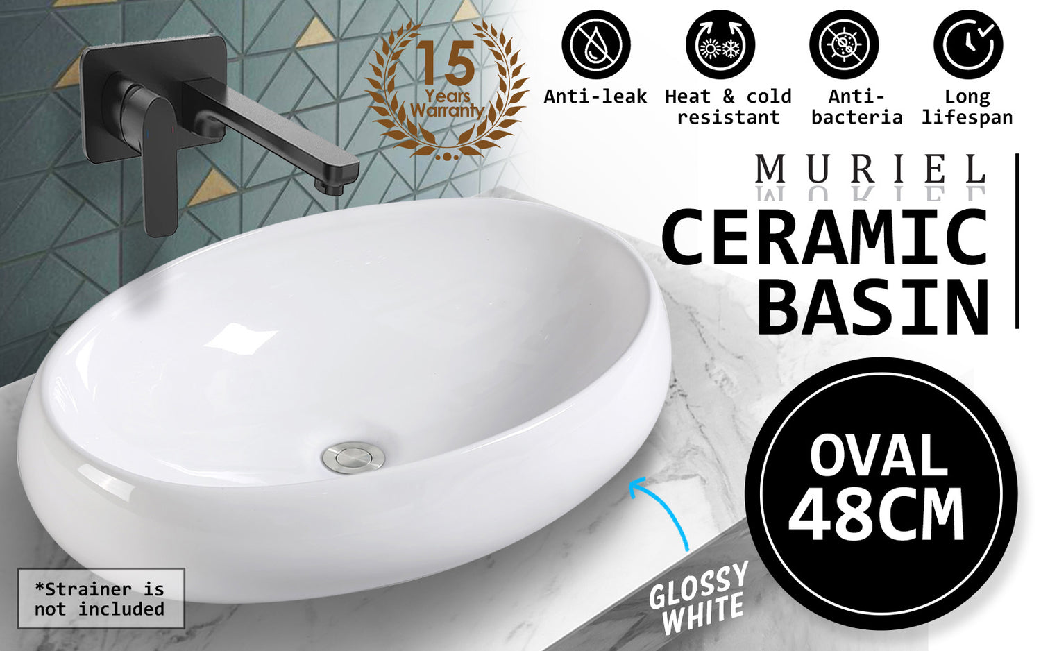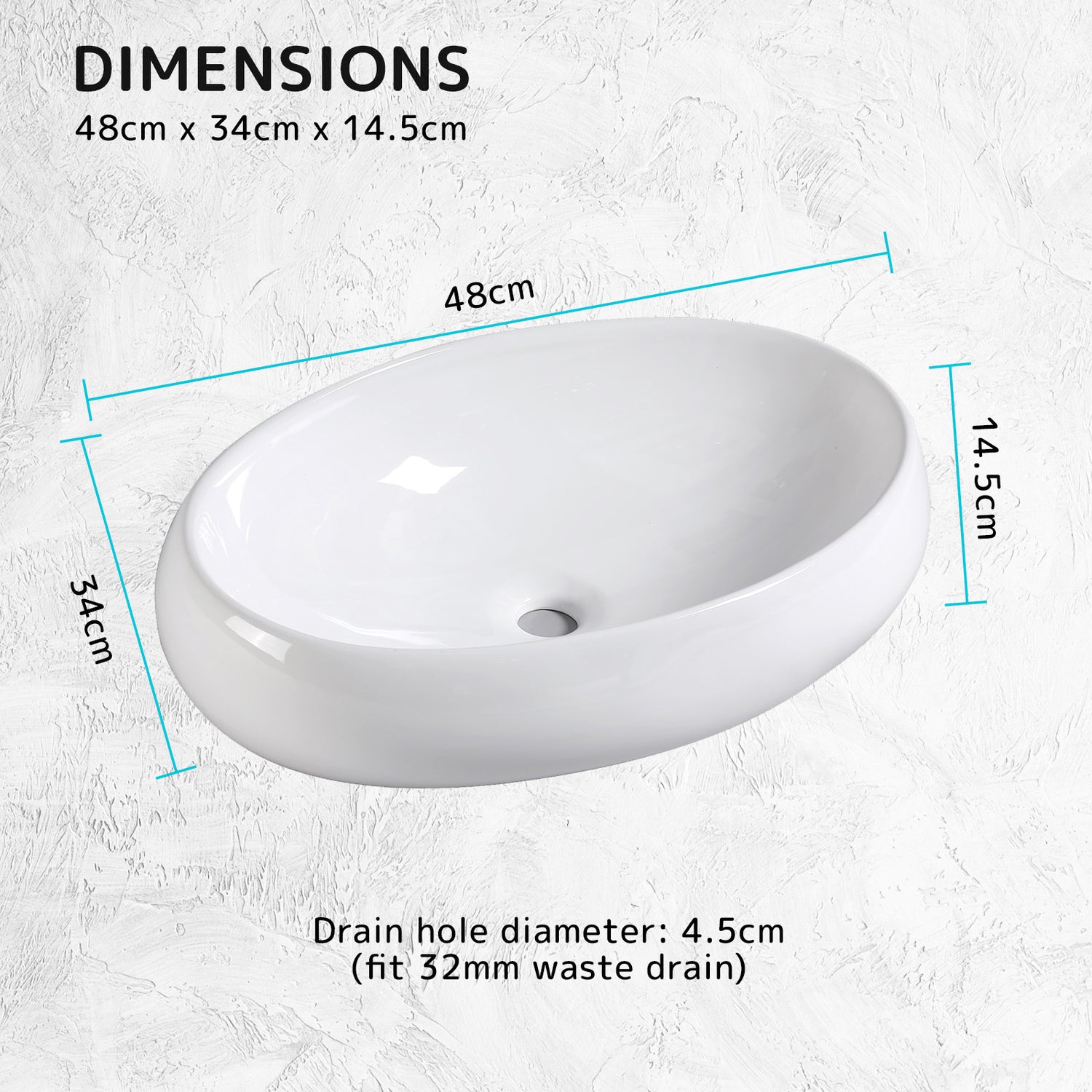 Muriel Ceramic Bathroom Basin Vanity Sink Oval Above Counter Top Mount Bowl 48 x 34 x 14.5cm - White