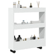 This narrow storage trolley is meant to be a decorative and practical addition to your home. Stable and durable material: Engineered wood is a durable and stable material with a smooth surface that is resistant to moisture, warping, and splitting, making it a reliable choice for a variety of projects.Ample storage space: The slim storage trolley provides ample storage space for keeping your various daily essentials well organised and within easy reach.Easy to move: This rolling cart, with the included four swivel wheels, can be easily moved to the desired place. The two wheels are lockable, which keeps the cabinet in position and adds stability.Wide applications: Depending on your needs, you can use this storage trolley in the living room, kitchen, or bathroom thanks to its narrow shape, even in small spaces.