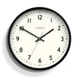 Newgate Jones Jam Clock Matte Black A black wall clock with an easy-to-read dial measured by linear hands and topped by a glass lens.