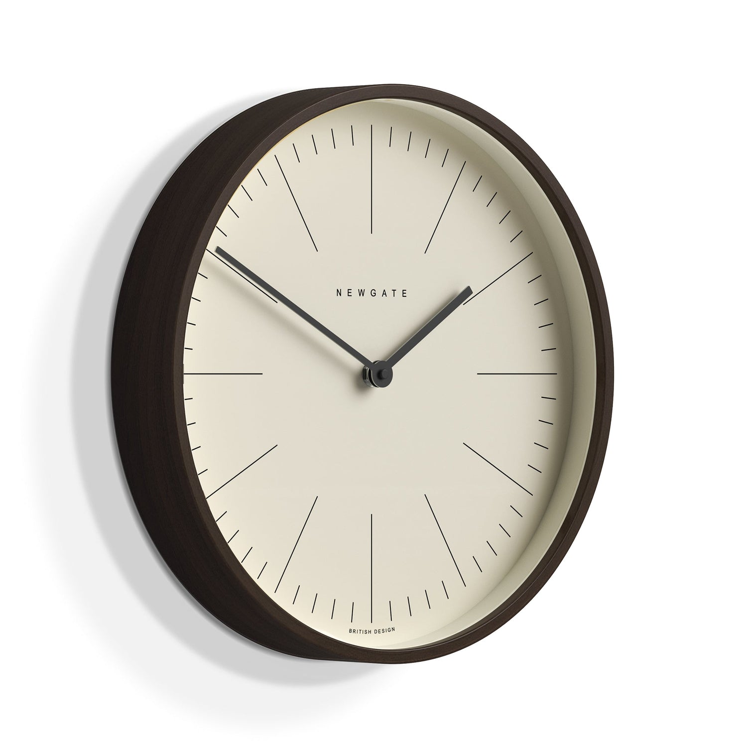 Newgate Mr Clarke Clock Dark Wood Marker Dial 28 A small dark plywood wall clock with a minimalist marker dial.