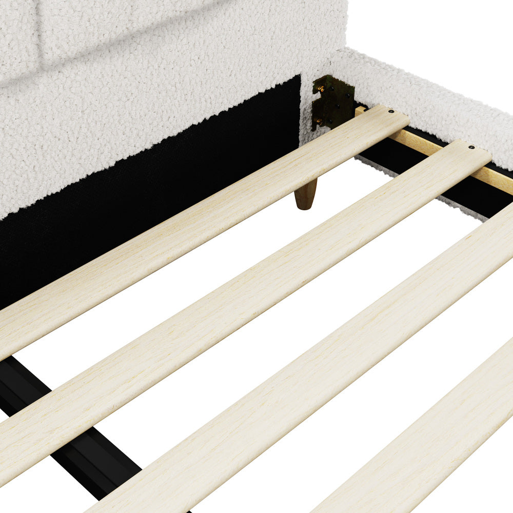 Featuring a unique scallop-shaped bedhead, the Okiture Elsa Bed Frame radiates with style and adds a luxurious presence to any bedroom décor. The sophistication factor is even more prominent with the white boucle fabric upholstery that covers the bed frame from head to end. Soft to the touch that lends a cosy and intimate aura to accompany your calm and restful sleep. But there?s more to the bedframe than just an attractive appearance. The finishing is meticulous with exacting workmanship all round. Inside, the thick 13mm plywood reinforced slats provide end-to-end support for the mattress while the sturdy rubber wood legs ensure that the bed frame stands up to durable use time and again. Better still, setting up the bed frame is hassle-free with Velcro-enabled slats that simply fasten to the bed frame for better grip and stability. In fact, the entire bed frame assembly can be completed in less than 30 minutes. The Elsa Bed Frame is compatible for use with most Australian-sized double mattresses.