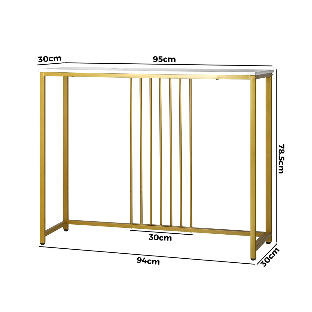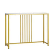 Crafted with high-quality materials and attention to detail, our console table is built to last. The sturdy metal frame provides a solid base for the table, while the smooth and marble-like tabletop offers a sleek and sophisticated surface for displaying decorative items or everyday essentials. The clean lines and modern design will complement any decor style, while the gold color frame make it stand out with your existing furniture.