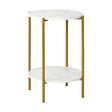 This elegant and sturdy Oikiture side table is the perfect addition to any living space. Crafted with a solid powder-coated base and top off with a faux marble top, this table exudes a sophisticated charm. The table's sleek design features a smooth, round tabletop that offers ample space for your everyday essentials, while the additional lower shelf offers even more storage options. Minimalistic and timeless, this side table will complement any decor style and elevate any room it's placed in. Its versatile size makes it perfect for use as a nightstand, entryway accent piece or a cozy reading nook companion. Durably constructed and easy to assemble, this Oikiture side table offers both style and function at an affordable price.