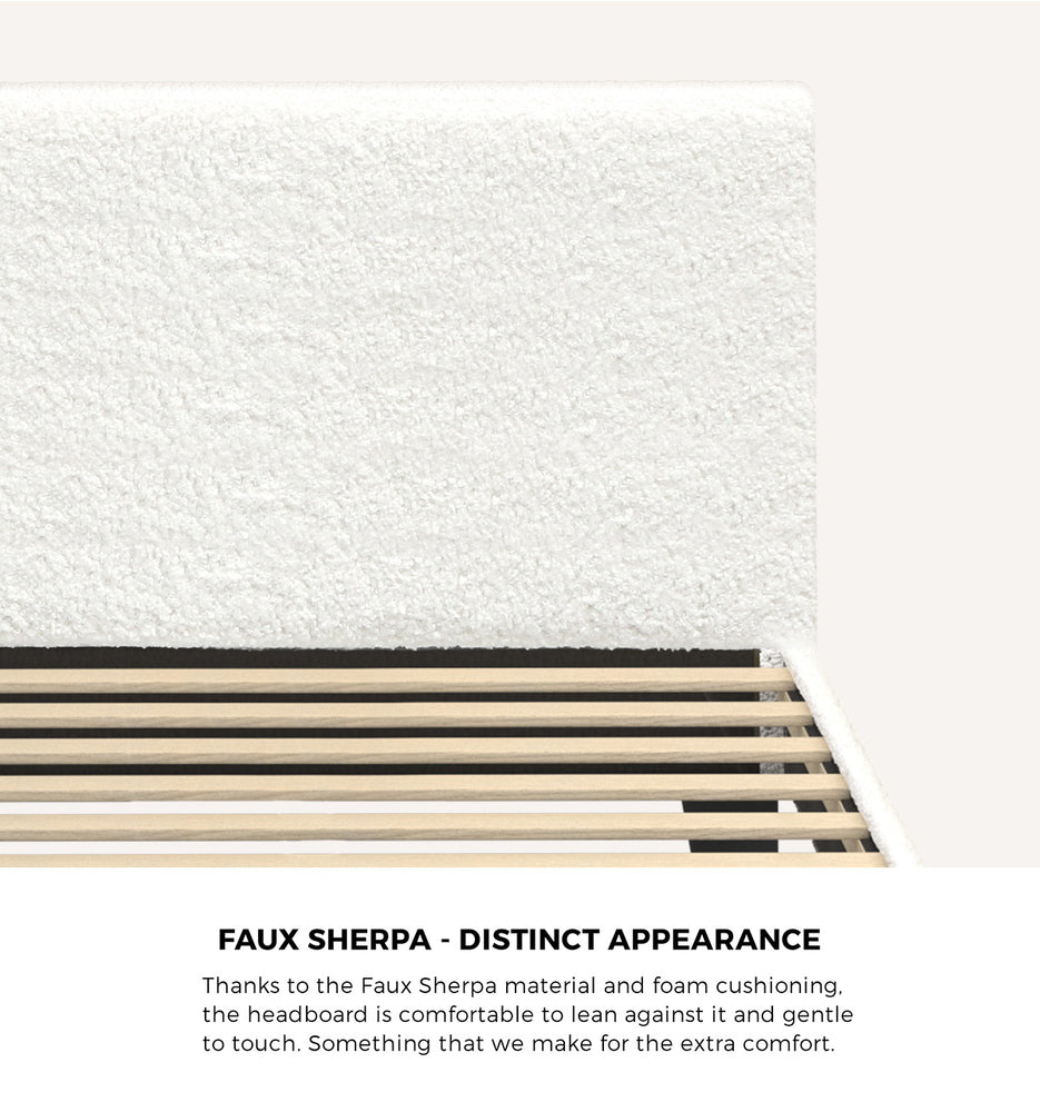 Finished in distinct wool-like appearance, the bedhead and frame are fitted with Sherpa material that is gentle to touch. You can lean against the headboard and feel the foam cushioned while reading a book or watching TV on your bed.
