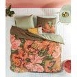 The Embroidered Flower Multi Cotton Sateen Quilt Cover Set by Oilily features a print of colourful coarsely embroidered flowers. The dominant colours here are brown, gold, pink, olive, red, burgundy, red, grey, indigo, yellow, and orange. The pillowcases have the same print as the cover. The quilt cover has a double face design and a uniform green back. The quilt cover is made of 100% cotton sateen.